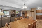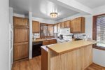 The fully equipped kitchen includes all major appliances, cookware, and dishware, with the dining area providing space for meals. Two outdoor parking spaces are included.