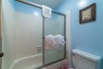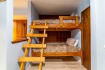 The primary bedroom features a queen bed and flat-screen Smart TV. A separate sleeping alcove near the entry includes a set of twin bunk beds. The bathroom offers a shower/tub combo with a separate vanity area.