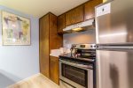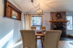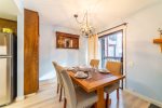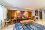 This ground-floor unit is all on one level. The open floor plan features a living room with a queen sofa bed, flat-screen Smart TV, Wi-Fi, and a wood-burning stove (wood provided). The dining area seats 4, and the fully equipped kitchen includes all major appliances, cookware, and dishware.