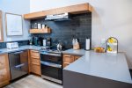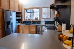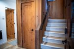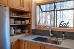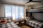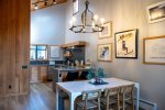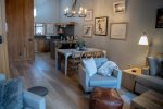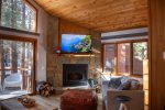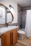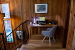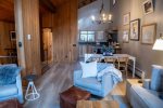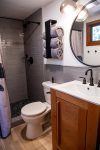 Upstairs, the open-concept living area features vaulted ceilings, a wood-burning fireplace, and access to a private deck. The living room has comfortable seating along with a queen sofa bed and a twin sofa bed for additional sleeping space. The dining area seats 6 and flows into the fully remodeled kitchen, which includes everything you need for home-cooked meals. The upstairs bathroom features a fully tiled walk-in shower, and there is also a convenient workspace at the top of the stairs.