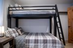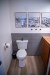 Enter on the first floor, where you’ll find both bedrooms and 1.5 bathrooms. The primary bedroom includes a king-size bed and large closet. The second bedroom features a queen bed plus a pyramid bunk bed (queen on bottom, twin on top) and has a private half bath. The main hall bathroom offers a shower/tub combo. Each bedroom is equipped with a TV, and a stackable washer/dryer is available for guest use.