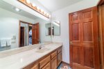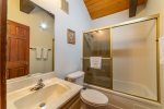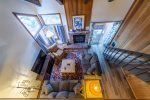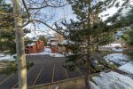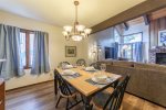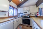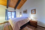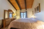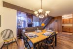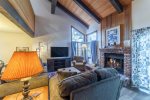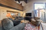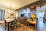 This bright corner unit offers vaulted ceilings, large windows, and mountain views. Enter up one flight of outside stairs. The first floor features the primary bedroom with a king bed and walk-in closet, a full bathroom, and an open living area with a wood-burning stove (wood not provided), flat-screen Smart TV, Wi-Fi, comfortable seating, dining area with seating for 6, and a fully equipped kitchen.