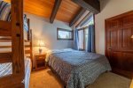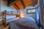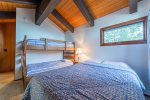 The loft is open to the living room below by a half wall and includes a queen bed, a set of bunk beds, and a second full bathroom.
