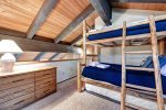 The loft is open to the living room below by a half wall and includes a set of bunk beds (twin on top, full on bottom), a twin pull-out bed, and the second full bathroom. An additional flat-screen Smart TV is located in the primary bedroom.
