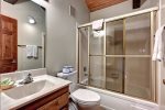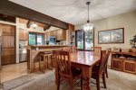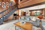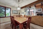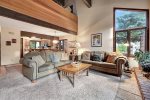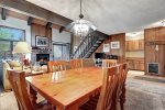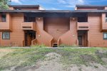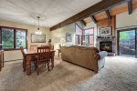 This bright corner unit offers vaulted ceilings and large windows that let in natural light. Enter up one flight of outside stairs. The first floor features the primary bedroom with a queen bed, a full bathroom, a fully equipped kitchen, dining area, and open living room with a queen sofa bed, flat-screen Smart TV, Wi-Fi, wood-burning stove (wood provided), and access to a private deck.